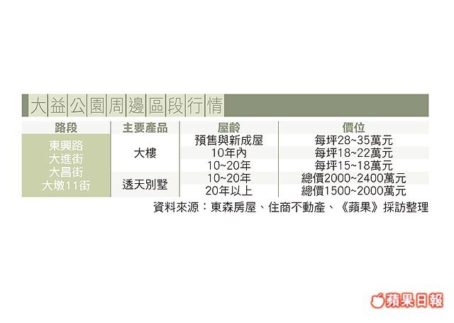 東森房屋台中大墩加盟店經理陳宏義指出,公園周邊以屋齡10~20年大樓為主,每坪主力15~18萬元,其中以3房含車位指名度最高,總價700~800萬元。