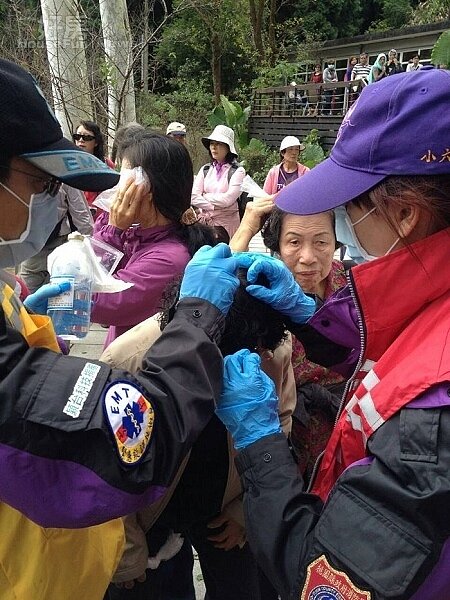 後慈湖風景區十三日上午發生一起虎頭蜂螫人事件,消防局人員抵達後立即為傷者包紮。(記者陳寶印攝)