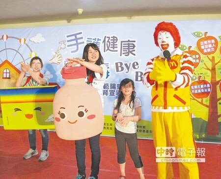 衛生局於2日在科工館舉辦防範腸病毒洗手教育宣導活動,麥當勞叔叔帶領小朋友洗手,呼籲大人小孩要勤於洗手,才是遠離腸病毒的不二法門。