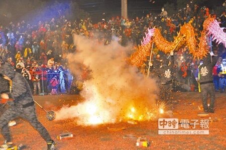 客庄12大節慶之一、苗栗市元宵(火旁)龍活動在20日晚間進入最高潮,(火旁)龍之夜有上萬條鞭炮在45分鐘內狂轟猛炸,要讓客家新年藉由(火旁)龍炸得暢旺整年,24日晚間將在苗栗市五文昌廟進行化龍返天,為春節系列活動告一段落。