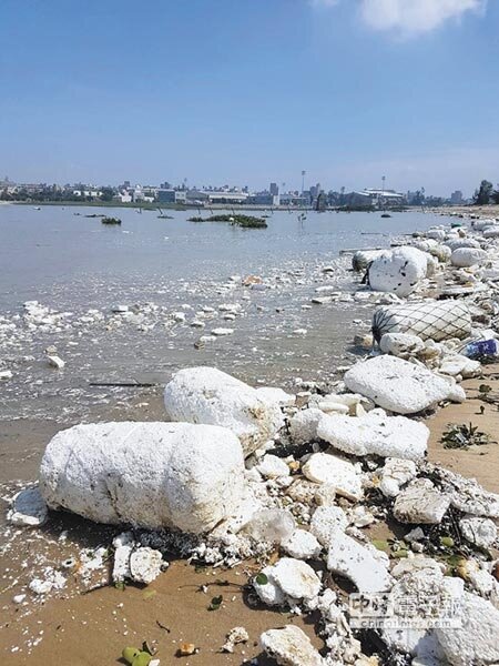 莫蘭蒂颱風狂掃,金門漏油造成海域汙染,也颳來數以萬計的養殖保麗龍球。(圖/中國時報)