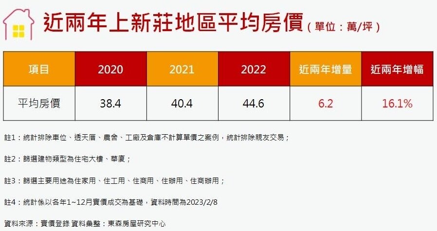 東森房屋新莊科達歐洲村加盟店店長曹鈞富認為, 台灣的房價向來是大漲小回,所謂的買房時機其實並不是最重要的事情,買對價格、買對區域、買對地段才是關鍵。以新莊來說,上新莊地區是目前重大建設最多、最值得關注的區塊,包括市府力促的塭仔圳市地重劃案、新北產業園區、中央合署大樓遷入,以及宏匯廣場、凱悅嘉軒酒店、i-Tower科技大樓等建設完工,依據實價登錄統計,2022年上新莊的平均房價約為每坪44.6萬元,相較於2020的每坪38.4萬元,短短兩年就上漲16.1%,顯見剛性買盤對上新莊房市的認同度頗高。