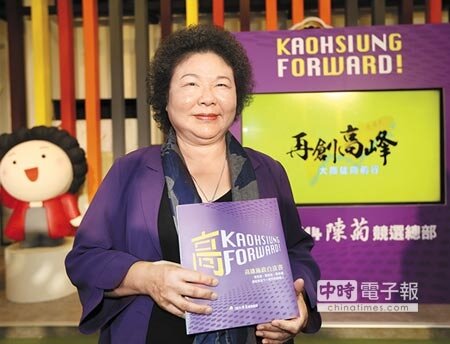 民進黨提名高雄市長候選人陳菊2日在競選總部的大高雄願景館,發表施政白皮書,她說,對高雄所懷抱的夢想始終唯一堅定就是高雄轉型,將持續以城鄉並進的發展策略,打造更宜居、更安全、更幸福的大高雄,並由立委林岱樺、管碧玲、陳其邁細數她的政績。