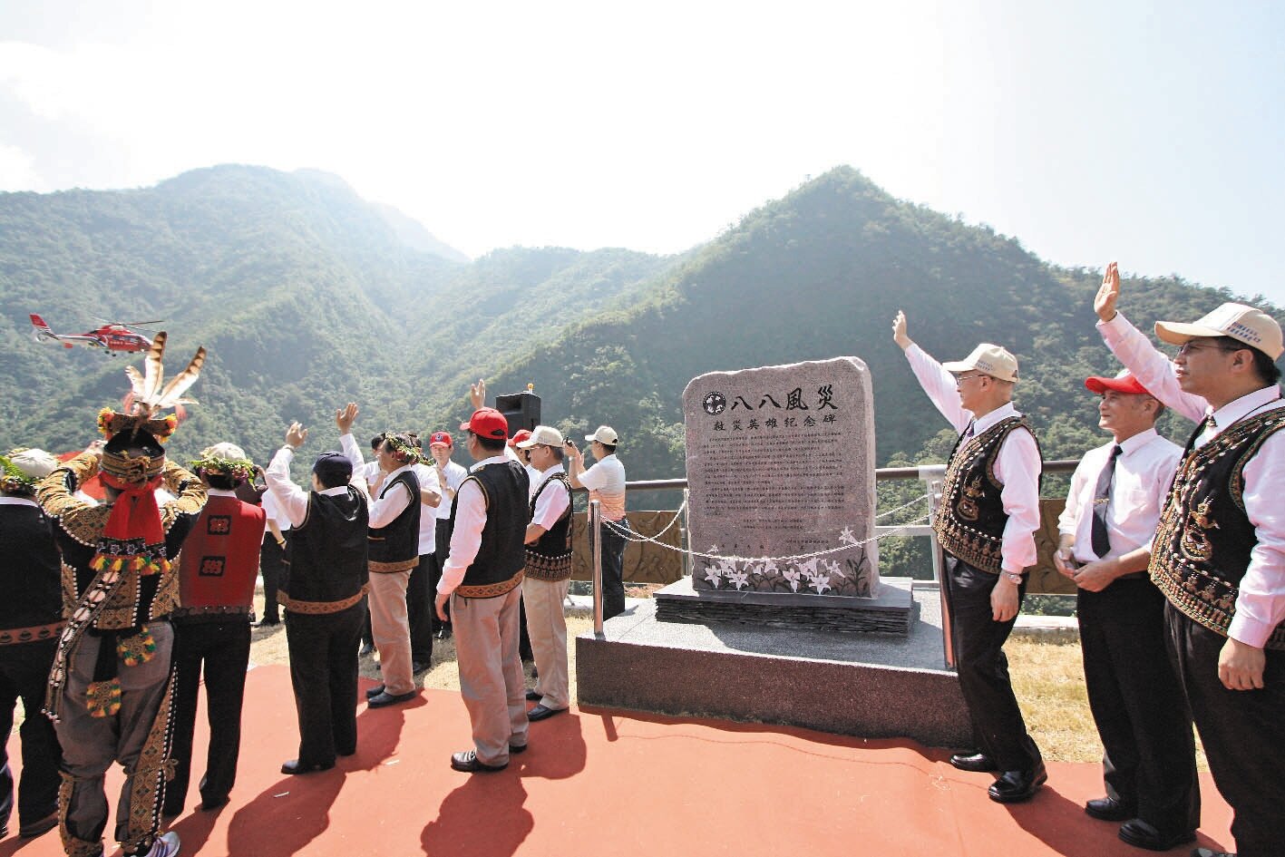谷川大橋「三地門端」設立八八英雄紀念碑,紀念為了救災而罹難的英雄,揭碑同時邀請直升機前來致敬。(記者陳沛佑/攝影)