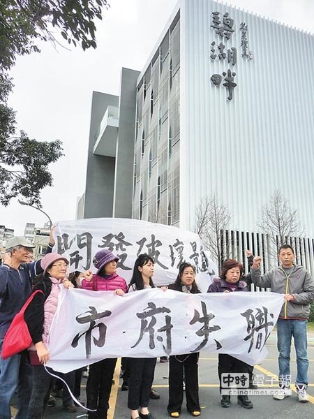 台北市議員高嘉瑜與碧湖公園周邊居民,昨天在湖邊拉布條呼口號:「反對建商破壞景觀,要求市府依法環評。」居民抗議建商要在當地興建一座地上26層達97.9公尺的超高豪宅,卻未事先環評,接待中心也已搭好。