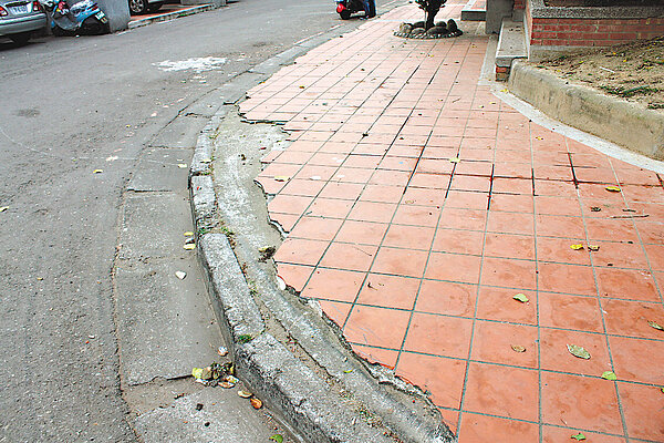 頭份鎮地標公園髒亂不堪,許多地磚因違規停車破損。(圖/蘇木春攝)