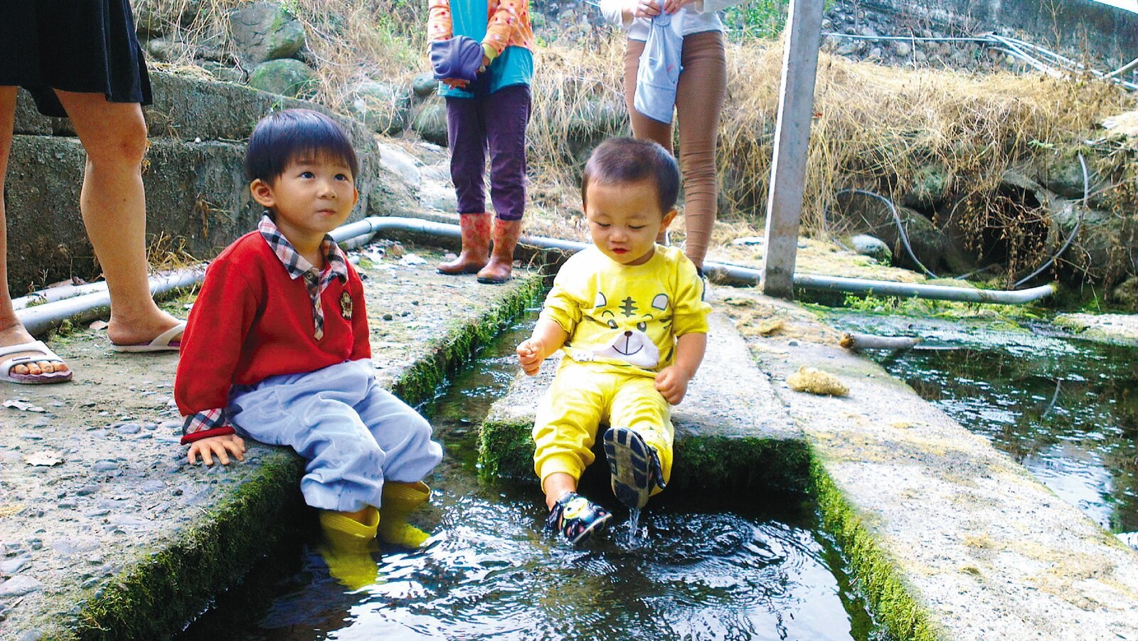 竹山鎮泉州寮的天然湧泉,吸引許多孩童前來戲水。(記者吳思萍/攝影)