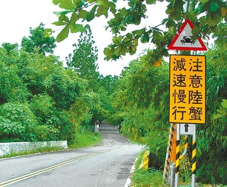 橫行我最大墾管處在香蕉灣、港口設置「注意陸蟹、減速慢行」交通標誌提醒駕駛。(郭韋綺攝)