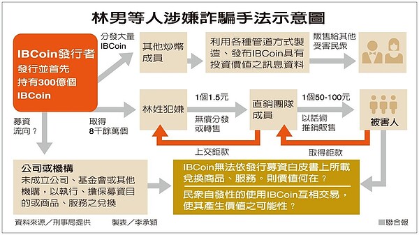 刑事局調查,林耿宏前年十月以人民幣兩百萬元,在大陸購買八千餘萬顆虛擬貨幣「IBCoin」,以無償或每顆一點五元台幣,販售給旗下十四名「下線成員」;下線成員以一顆五十到一百元的價格賣給民眾,宣稱會漲數十倍。