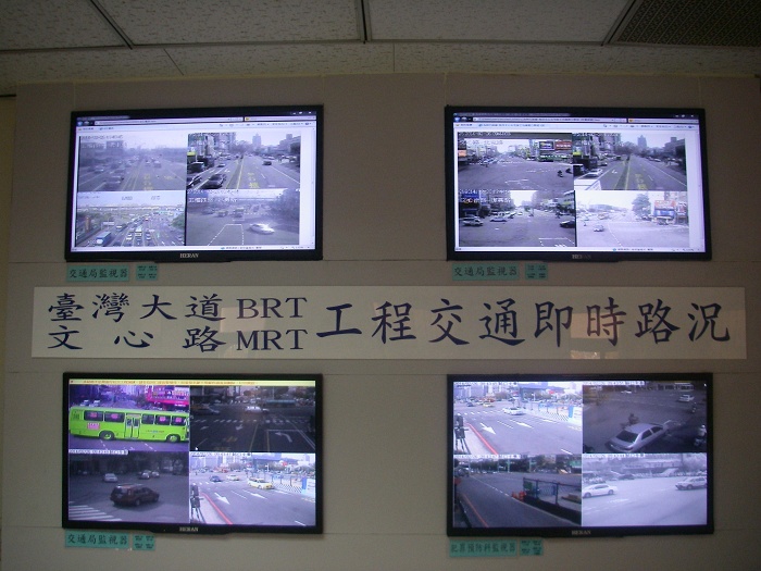 目前正值臺灣大道快捷巴士藍線(BRT),及文心路捷運綠線(MRT)工程施工期間,沿線施工圍籬封閉部分車道,車多易致壅塞,為維持施工期間交通順暢,因應交通監控所需,市警局交通警察大隊,於103年1月在勤務指揮中心,新增設交通路況電子牆1組(4臺電視螢幕),每臺監看4個路口,專責用於監看各沿線16個施工重要路口(段),即時掌握交通狀況。