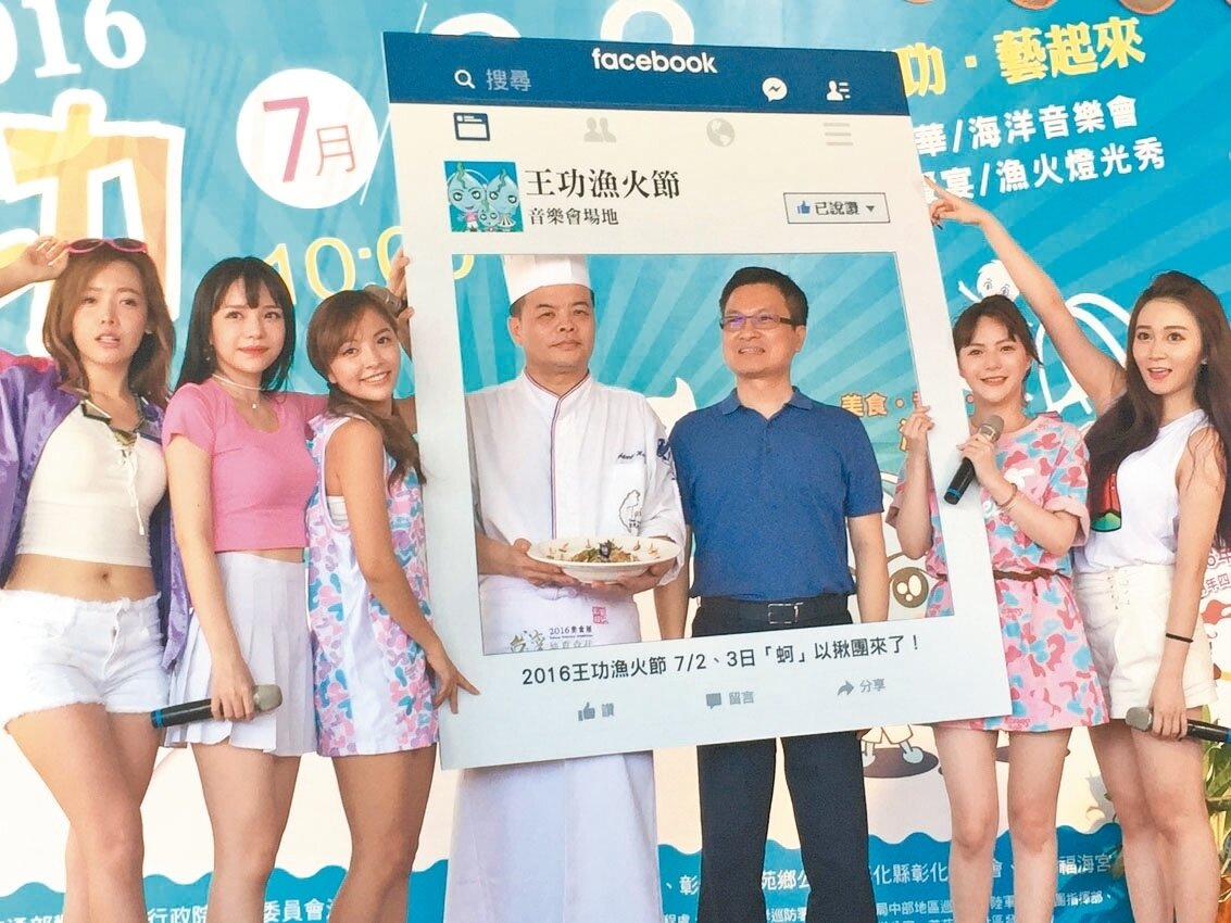 魏明谷昨天與彰化區漁會總幹事陳諸讚、芳苑鄉長洪和炉、福海宮主委林益模等地方人士為王功漁火節宣傳,並安排漢寶國小舞獅、甜蜜系女孩Twinko暖場表演。