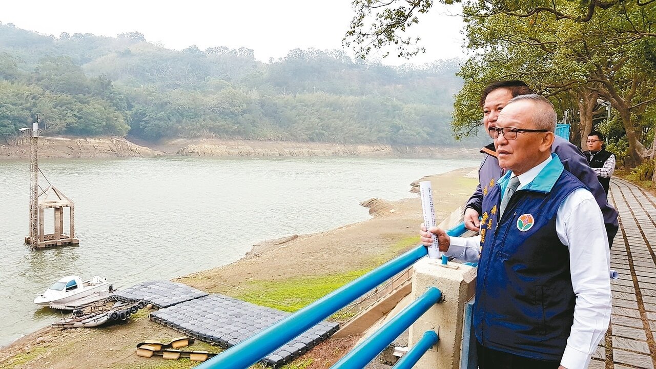 苗栗縣明德水庫水位創下24年來同期新低紀錄,縣長徐耀昌昨天視察明德水庫水情。(記者黃瑞典/攝影)