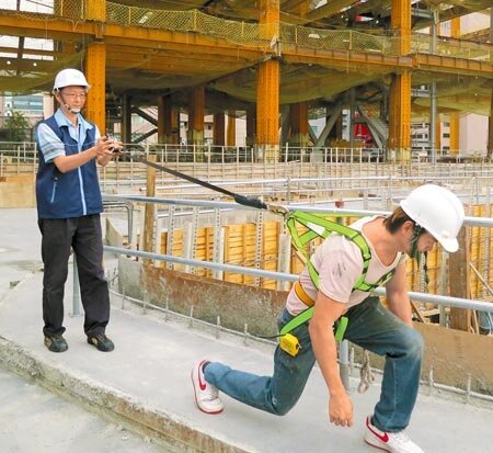 洪嘉男昨日身著背負式安全帶,示範捲揚式防墜器的使用,勞檢處長鄒子廉表示,只繫於腰間的安全繩,雖然可救人一命,卻可能讓脊椎受傷,背負式安全帶有五個點可分散受力,更為安全,最近將繼續實施「高溫室外作業勞動檢查」。