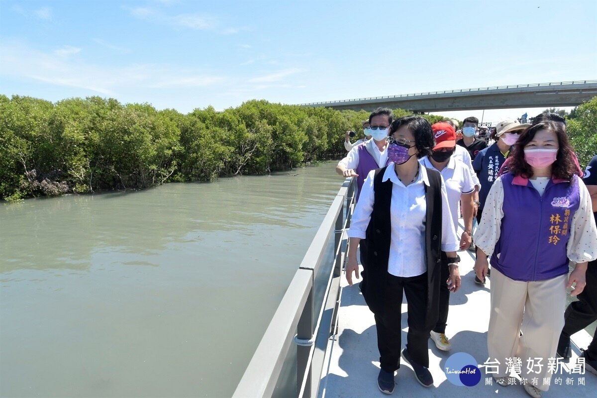 芳苑濕地紅樹林海空步道正式開放啟用,縣長王惠美引領鄉親一同步行參觀。圖/記者鄧富珍攝
