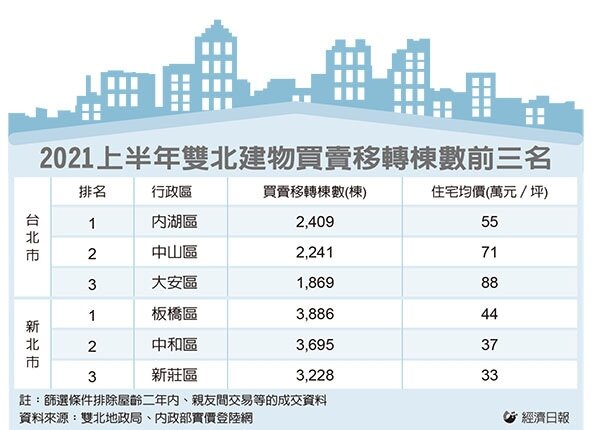 台北以內湖區、中山區與大安區買氣最熱,其中內湖區跟中山區實力堅定,近年持續穩居交易熱區排行一、二名。台北市以內湖區2,409棟獨占鰲頭,除有內湖科學園區吸引科技人才居住,鄰近內湖的南港、汐止也形成「港汐湖」的通勤生活圈,未來該區極具發展潛力。