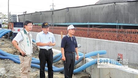 台南市議員郭國文(左)昨邀集水利局長李孟諺(中)會勘永康區大灣排水整治工程,關切治水進度。(記者曹婷婷攝)