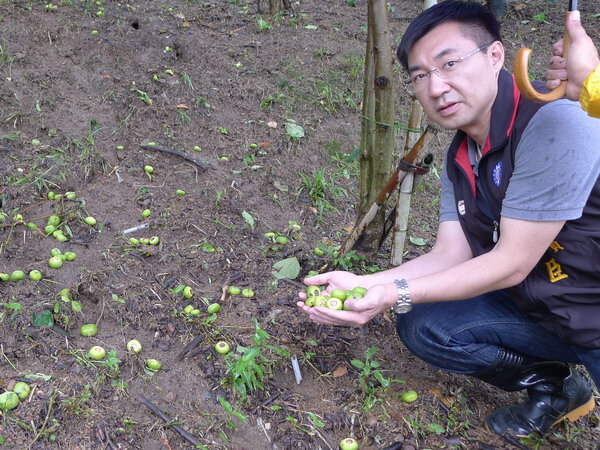 立委江啟臣與農委會相關單位人員到和平達觀地區勘察,發現甜柿落果情況嚴重。(記者/黃玉鼎攝)