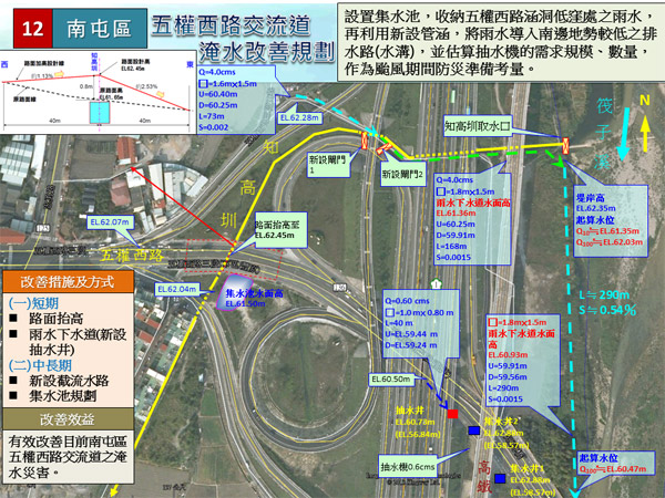水利局投入經費約3,300萬元,並與交通部臺灣區國道高速公路局達成協議分攤部分經費辦理,除了新設截流溝匯集雨量排至筏子溪外,並將五權西路路面抬高導入現有排水溝,涵洞處設置集水井、排水箱涵及抽水設備,將水抽排至筏子溪,有效解決低窪排水問題。