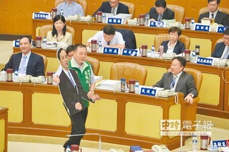 去年底朱立倫請假參選總統,缺席第2次市政總質詢,民進黨團製作真人大小的朱立倫人形立牌放在備詢台,諷刺朱跑去選總統。