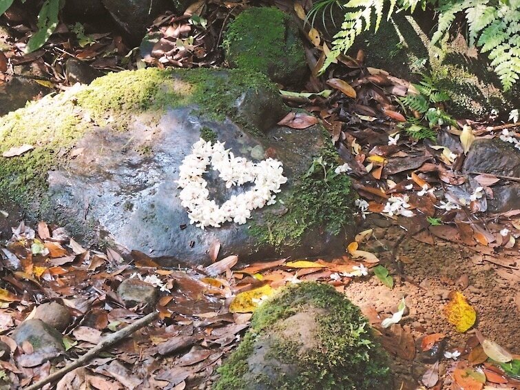 小粗坑 好心情龍潭小粗坑步道桐花近日綻放,吸引大批遊客造訪。不少攝影愛好者將桐花排列成愛心形狀(圖),十分美麗。 記者賴佑維/攝影