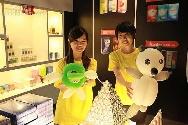 達人將衛生套製成時下最「萌」的熊貓寶寶「圓仔」及怪獸大學的大眼仔,展現全台品質最佳的衛生套「可塑性」與延展性。(記者黃村杉攝)