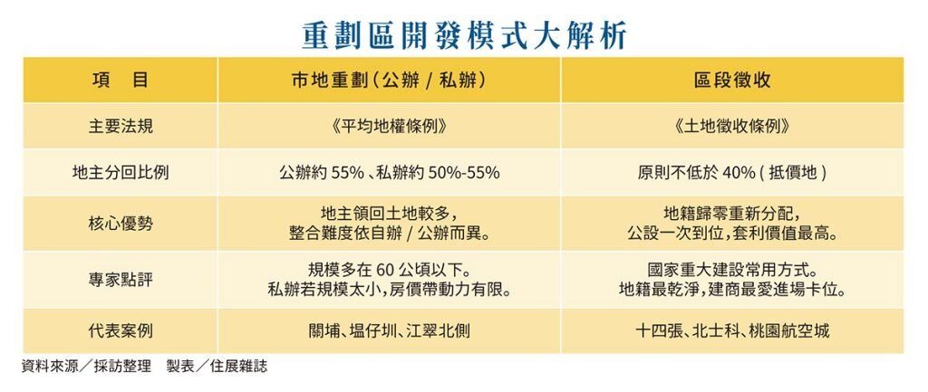 | 專家點評 | 規模多在 60 公頃以下。私辦若規模太小,房價帶動力有限。 | 國家重大建設常用方式。地籍最乾淨,建商最愛進場卡位。 |