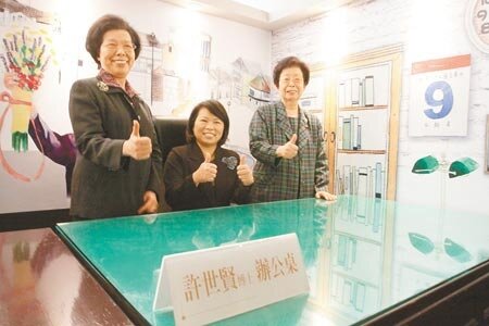 剪綵儀式後,張文英、張博雅及黃敏惠3位前後任市長等人重溫許世賢各時期事蹟及故事點滴,展館裡擺放著一張許世賢擔任嘉義市長時的辦公桌椅,3人中僅黃敏惠沒坐過,興致一來也試坐看看,留下難得畫面。