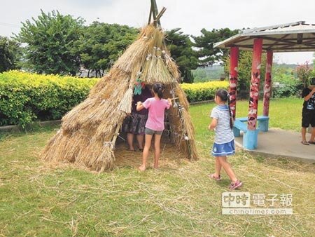 通霄城中國小學童今年暑假和老師聯手,首次挑戰在校園搭設稻草屋,稻草是校田收割後剩下的草料,師生再去竹林砍竹枝、剖竹片來做結構,高年級帶低年級嘗試綁草團、做門牌,2周的夏令營活動搭好3座「秘密基地」,學生誇下海口直說以後要蓋更大間的草屋,讓大家一起避暑納涼。