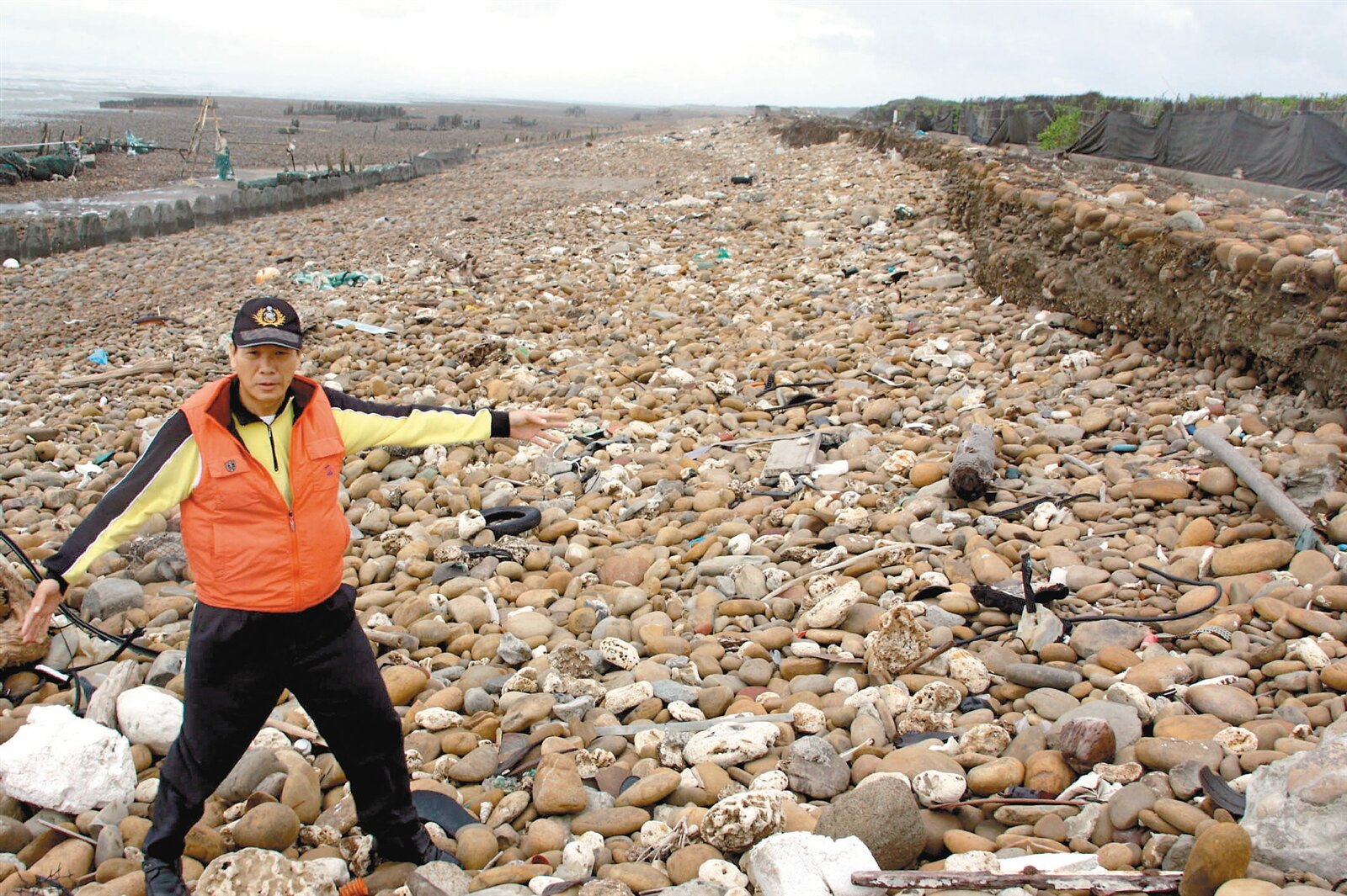 卓榮騰說,從新街溪到埔心溪出海口,約3公里海岸線,10幾年前規畫為「黃金海岸」,當時政府為了不破壞海岸生態、環境,圳頭段的海堤1公里多,採用生態工法施工,如今強大風浪,這段生態工法的海堤不堪一擊。