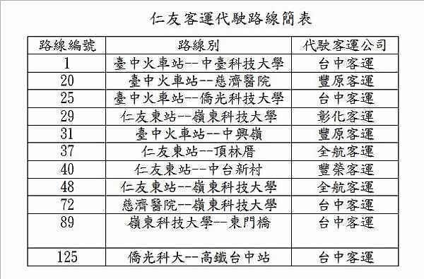 在台中市行駛多年的市公車仁友客運公司,因財務狀況吃緊,駕駛員薪資常無法準時支付,駕員時有請假或怠班情形,致使人車調度無法因應所屬路線班次需求,脫班、誤點情事頻傳,進而影響許多通勤學生及民眾之搭乘權益。台中市府交通局主動於16日緊急召開會議,邀集所有市區客運業者研商緊急應變計畫,初步決定仁友客運公司自4月17日起,暫時將該公司所屬11條路線由其他市區客運業者支援,其中1、25、72、89、125由台中客運代駛,20、31由豐原客運代駛,29由彰化客運代駛,37、48由全航客運代駛,40由豐榮客運代駛,以維持該公司所屬路線的正常營運,並維護民眾的搭乘權益。