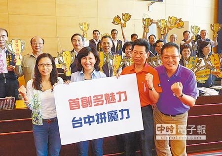 市議員朱暖英、黃馨慧、洪嘉鴻、陳成添(由左至右)等,昨日頒發全國首創的獎盃給各局處長。