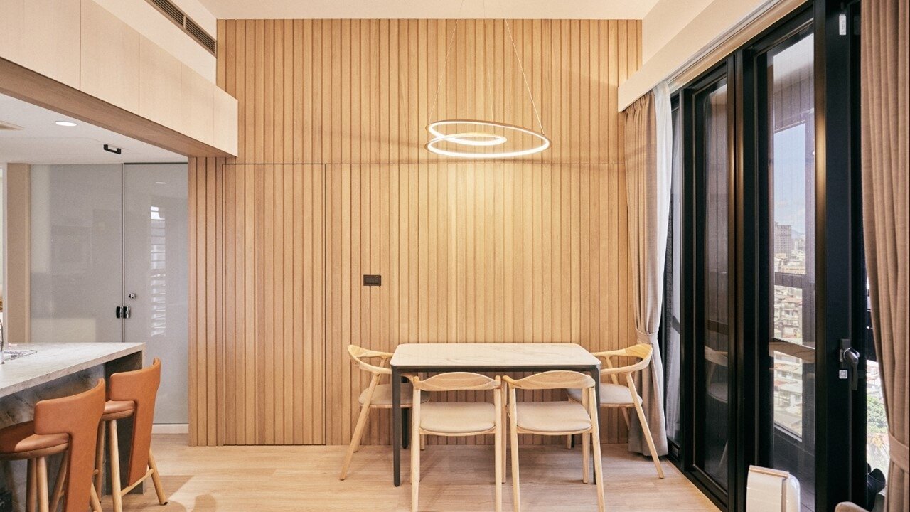 房門對到大門,原本還想把房門改到右邊,但最後採用裝修團隊的建議,使用造型格柵隱藏門,後來覺得這面牆看著看著蠻舒服的。