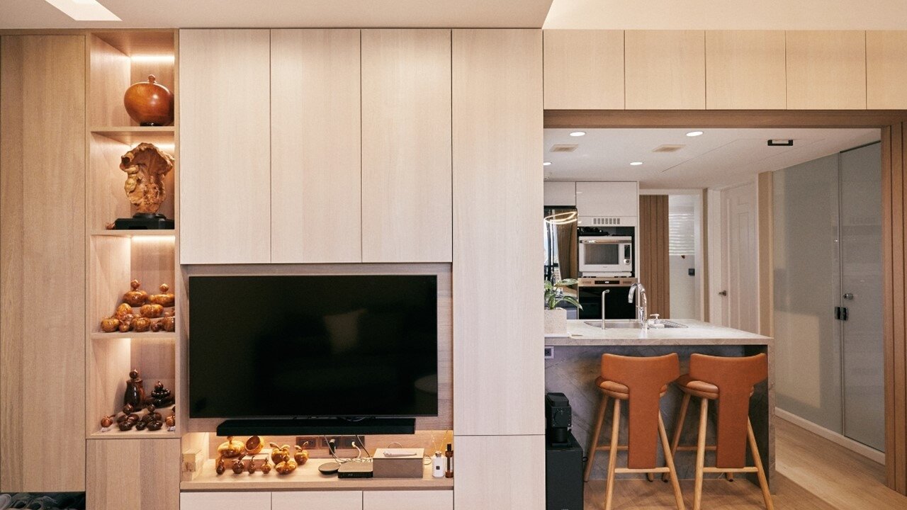 沙發往電視、廚房的視角,通透的吧台,讓煮飯的人能時不時與家人聊天;當初裝修團隊有建議超耐磨地板的底墊要加厚,踏感不錯,也會減少走路的噪音,不擔心吵到樓下鄰居。