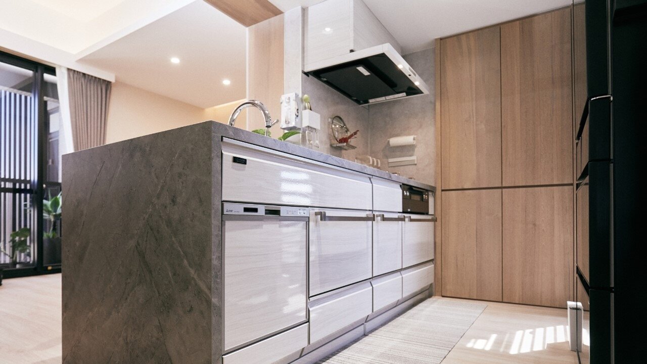 屋主表示,當初挑選廚具的訴求是實用、耐用,上網做功課後再到門市參觀,業務小姐在了解我們的需求後,提出了三個版本供我們選擇,最後我們挑選全部以日系三機來搭配,有些電器是透過朋友或代購購買,成品也相當不錯,使用了一陣子分享給想了解日系廚具的朋友。我們規劃的是開放式廚房,一字型櫃體,3個琺瑯下櫃,烹飪區右起為75公分的爐台櫃、60公分的料理台櫃、120公分的水槽櫃、再加上自備的45公分洗碗機。為了保有採光不裝上吊櫃,以足元底抽加強收納空間,一般廚具會做踢腳板,防止櫃體離地太近而受潮,不過琺瑯廚具不怕濕氣的特性可以排除這問題,因此可以將下方的踢腳板空間轉變為收納空間。