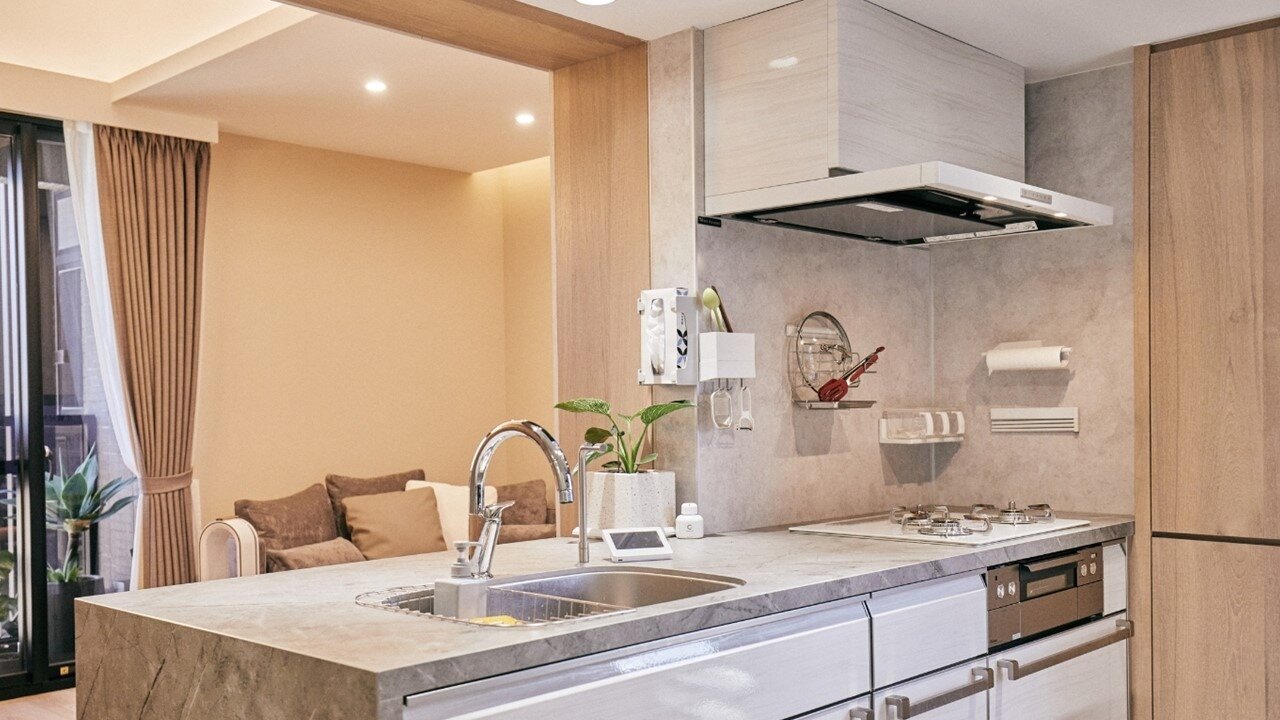 排油煙機吊掛,請木工加強櫃體結構,並減少牆面厚度,牆面也順便與客廳做出空間上的區隔。