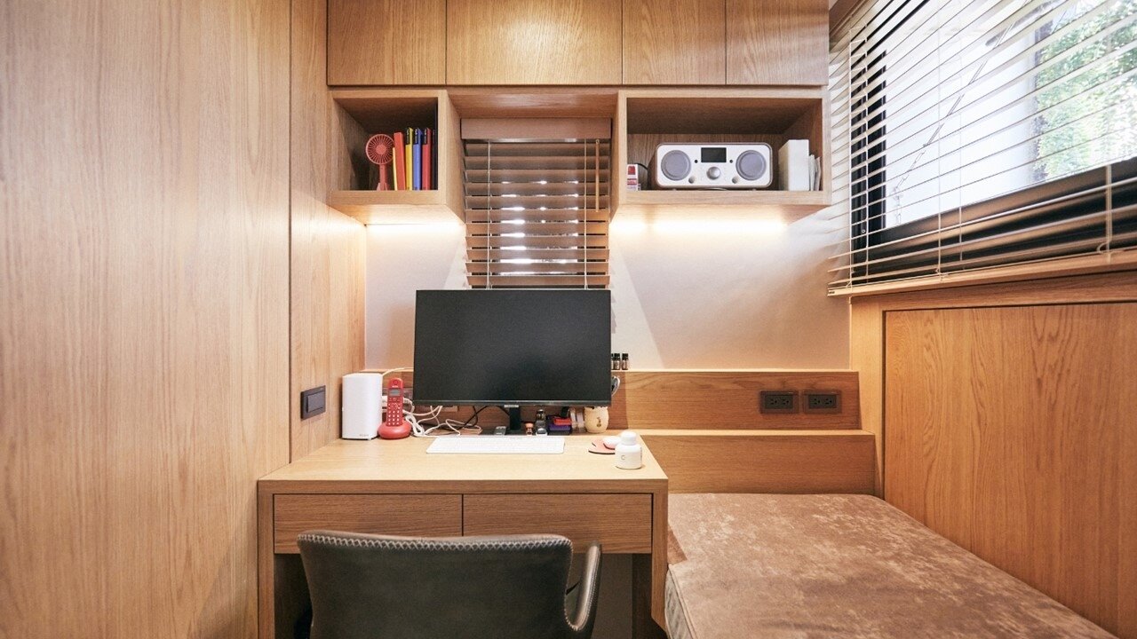 書房裡的臥榻,工作累了可稍作歇息,或是客人來的時候當作單人床使用,右邊窗戶下設有衣櫃及傳真機、印表機等事務收納空間。