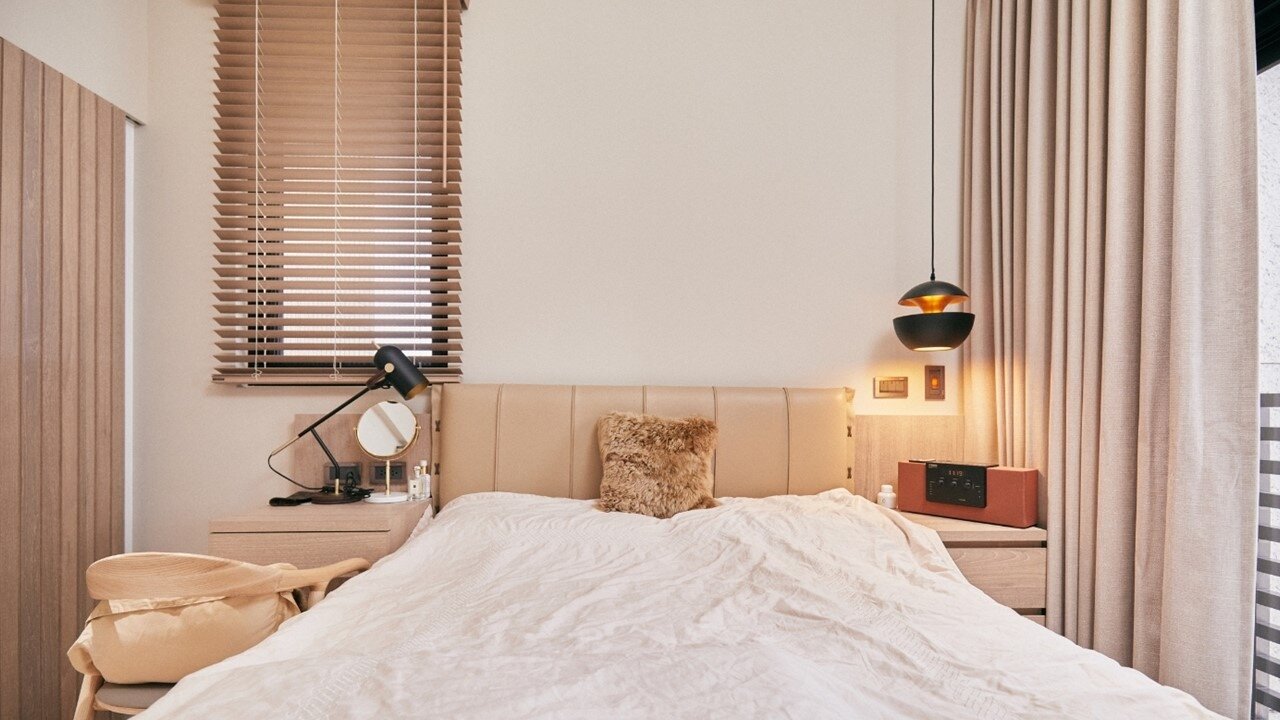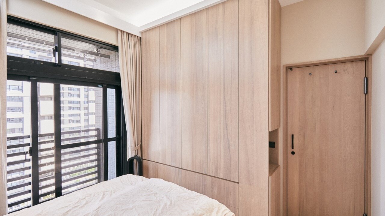 由於主臥空間狹小,收納櫃做到頂天,創造最大的收納空間。