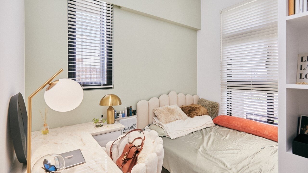 同樣選用 NAPPA 的牛皮床頭板,舒服也好清潔;女兒找了一些喜歡的風格照片,與裝修團隊討論後,做出來的女兒房成品。
