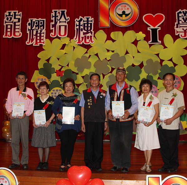 平鎮市大10周年慶,資深教師群、志工與學員們共同出席接受校長陳萬得表揚。(記者潘瑞如攝)