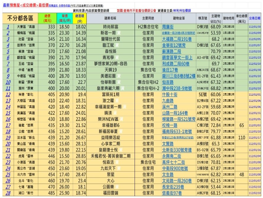 台南市估價師公會統計內政部實價登錄資訊,今年1月迄3月21日的全台各行政區最低總價的預售屋,以高雄市大寮區最低,「時尚薪富」18.02坪2房型以總價333萬元成交,單價為每坪18.5萬元。