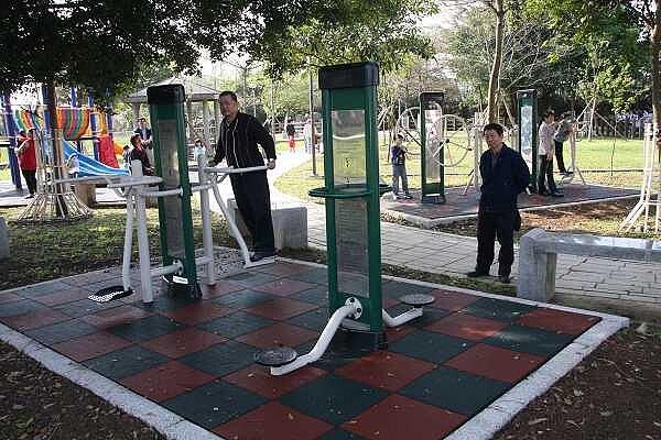 公園增設的體健設施陸續完工啟用,可享受雙人晃板組等體健器材的效用。(記者吳世傑攝)