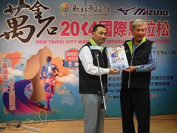 新北市萬金石國際馬拉松,副市長侯友宜在報名宣傳記者會中正式遞交認證申辦書。(記者黃村杉攝)