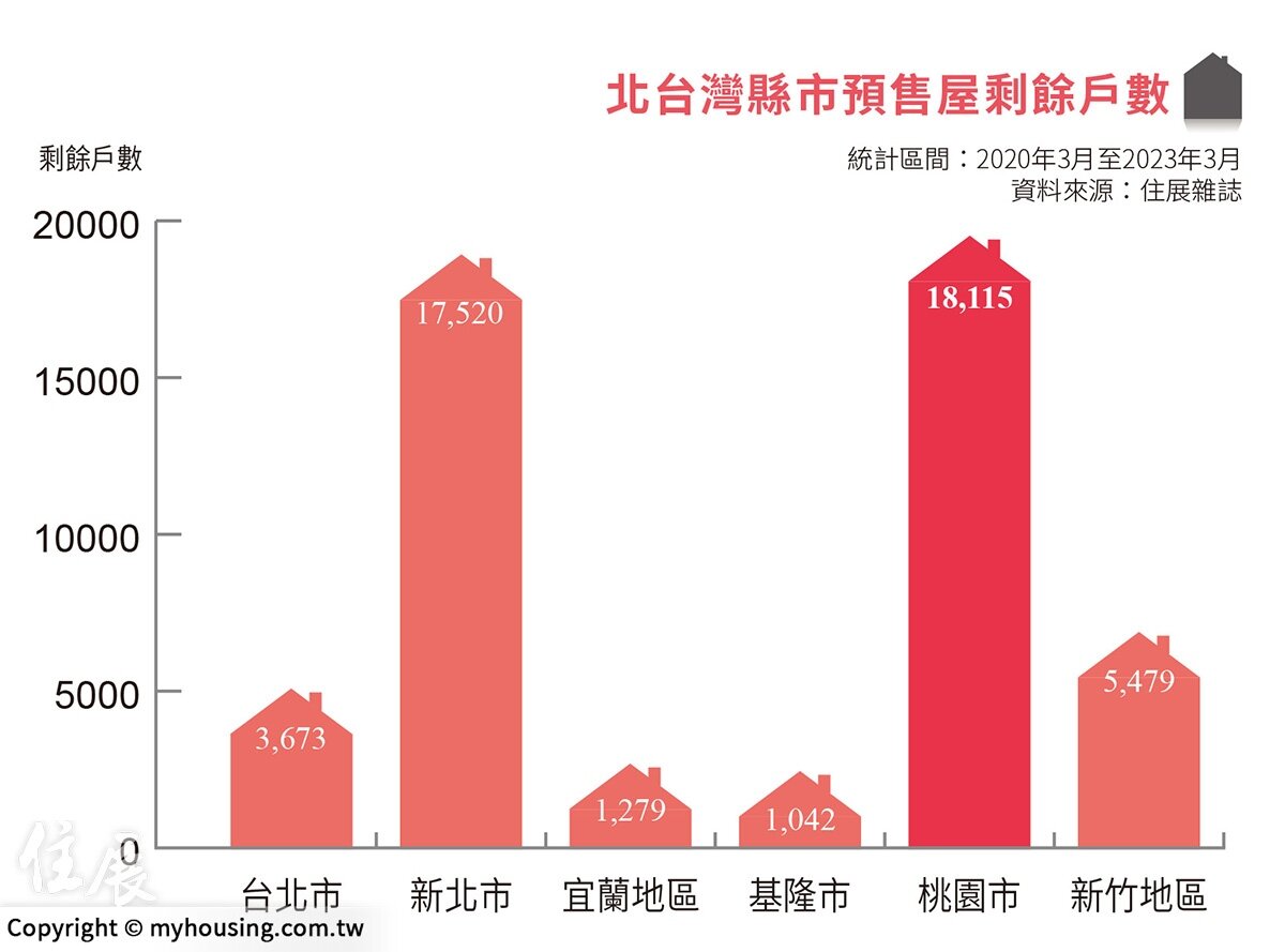 北台灣近三年預售屋剩餘戶數最多的是淡水,約4,013戶,因為從北段淡海新市鎮到南段紅樹林、竹圍地區,當前都有多宗大量體預售建案銷售中。預售屋剩餘戶數第二名則是桃園,約3,470戶,戶數集中小檜溪和中路重劃區,以及舊市區如大有地區等。緊接著是中壢,預售屋剩餘戶數約3,376戶,居北台灣第三,供給主要來自青埔特區。