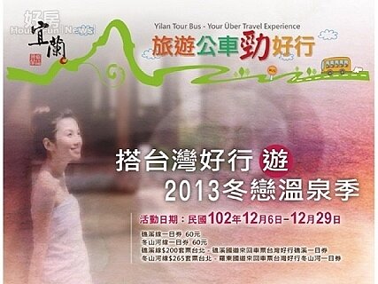 2013冬戀宜蘭溫泉季已熱鬧上場,為提倡低碳旅遊,並鼓勵遊客撘乘國道客運享受溫泉之旅,宜蘭縣政府自11日起與首都及葛瑪蘭客運業者,推出「台北-礁溪國道來回票180元送台灣好行一日券」優惠交通套票,環保又實惠。