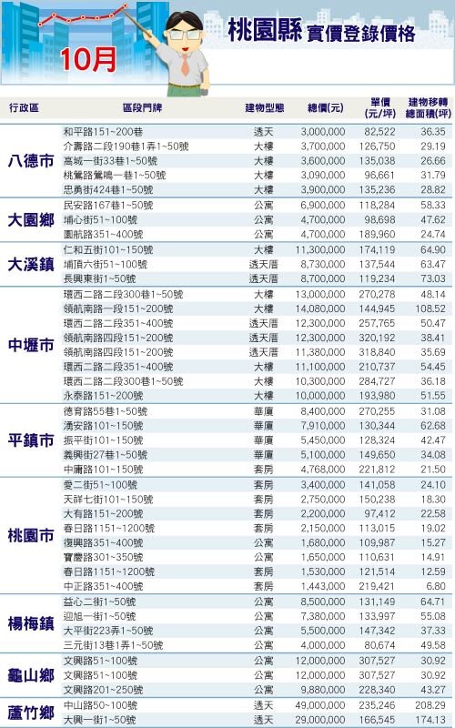 2012-12-22 10:54 A- A+ 人氣 3768 10月桃園縣實價登錄價格 #不動產 #透天 #公寓 #內政部 #實價登錄 #大樓 #租售 註:實際價格與內容以內政部網站為準 資料來源:內政部不動產交易實價查詢服務網 更多新聞→ 延伸閱讀→ 10月台北市實價登錄價格 10月竹苗縣市實價登錄價格 10月新北市不動產租賃實價登錄價格 房價更透明! 下半年起實價登錄免費下載 10月高雄市不動產租賃實價登錄價格 10月 北高雄市實價登錄價格 10月 南高雄市 實價登錄價格 10月台北市不動產租賃實價登錄價格 台北房多貴?去年成交過半逾1,380萬 內政部:房地產景氣明顯趨緩 分享 0 熱銷建案&網友看屋心得 好房網不只有新聞,還能找優質宅 訂閱 好房網News粉絲團