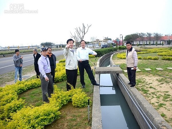 結束在虎林國小的視查,許明財市長轉赴虎山里新竹空軍基地外圍處,由林里長引導參觀由該里社區志工維護的休閒綠地,對於此地常有大批觀賞幻象2千起降的民眾聚集,中間卻有一條寬約1米的排水明溝,恐易發生不慎摔落意外,林里長爭取該處約200米的明溝加蓋,另在邊坡土丘較高處,加設36米的擋土牆。
