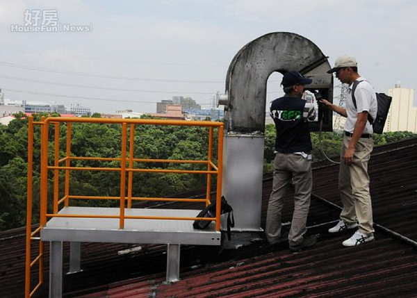 稽查人員攀爬上離地5公尺高度之廠方鐵皮屋頂,進行污染源蒐證作業。