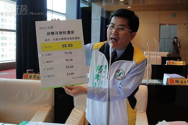 楊議員則認為市府應該重視細懸浮微粒PM2.5的嚴重性,他指出,連麥寮六輕懸浮微粒PM2.5也會飄到、彰化; 台中,民眾只能載口罩,環保署公布101年各縣市懸浮微粒濃度排名台中市全國第一,可想而知「細懸浮微粒」PM2,5的嚴重性。