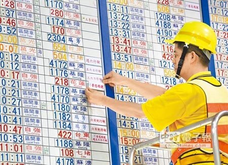 台鐵今起實施東線列車時刻大改點,板橋火車站工作人員15日正在更換新的火車時刻表。(記者王錦河/攝影)