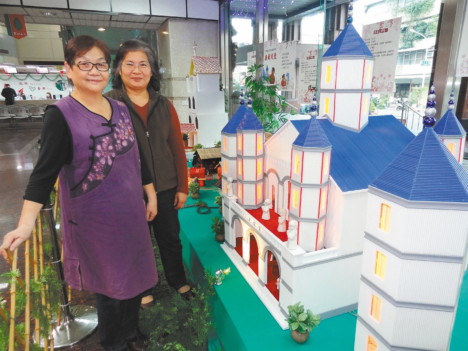 病友家屬蕭麗珠(左)和許春月(右),以針灸套管和氣球棒等環保材料,堆疊出歐風教堂城堡,細膩做工象徵著她們照顧親人的細心、耐心。(記者蔡容喬/攝影)